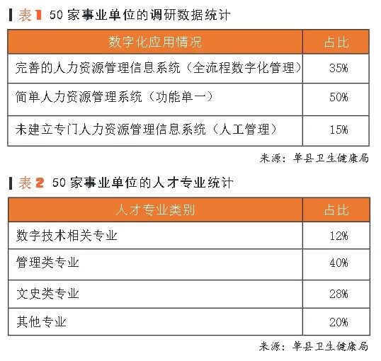 目前,一些事业单位在人力资源管理方面还没有很好地利用数字技术,存在着信息系统不完善,数据利用率不高的问题。从50家事业单位的调查资料中得出(如表1所示),只有35%的事业单位建立了比较健全的人力资源管理信息系统,在招聘、培训及评估等方面实现全过程的数字化管理;50%的事业单位虽有简易的人事管理系统,但功能单一,只能满足基本的资料录入与查询需要;另有15%的事业单位还没有建立专门的人力资源管理信息系统,仍然沿用传统的手工管理模式。